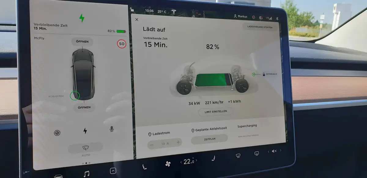 Der Verbrauch auf der 400 km langen Strecke lag bei durchschnittlich 15.9 kWh/100 km bei einer Durchschnittsgeschwindigkeit von 72 km/h und 3 Personen an Bord - meine Mutter wurde 70 Jahre und feierte ihren Geburtstag in Rothenburg. Bei 35 °C Außentemperatur war die Klimaanlage des Tesla Model 3 eine segensreiche Einrichtung, weil man das Auto auch im parkenden Zustand vorkühlen kann. Die Klimaanlage per Tesla-App 10 Minuten vor dem Einsteigen mit 20 °C starten und man hat eine angenehme Innenraumtemperatur und auch die Sitze und das Lenkrad verursachen keine Brandzeichen. Meine Mutter ist keine begeisterte Auto-Mit-Fahrerin. Im Tesla fühlte sie sich aber nach eigener Aussage sehr wohl. Besonders bemerkenswert findet sie das ruckelfreie, leise Beschleunigen - und eben die Klimaanlage, die auch im Stand weiterlaufen kann.