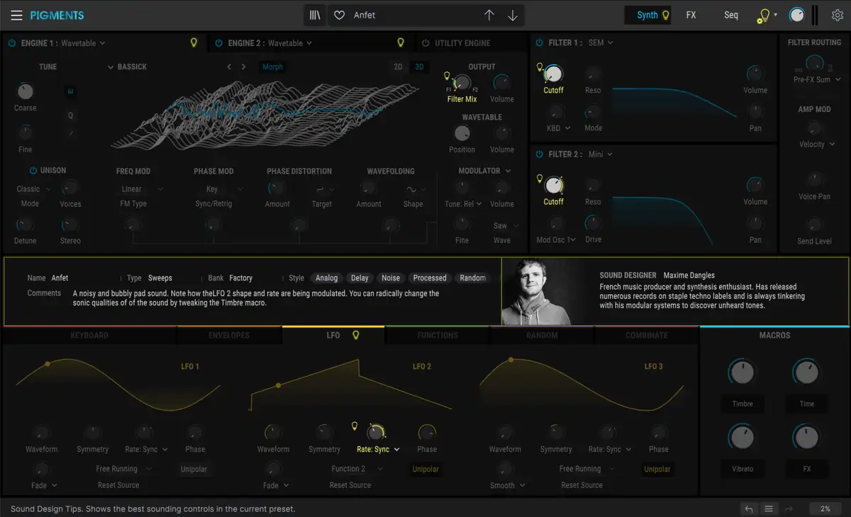 So übersichtlich und strukturiert wie Pigments auch ist, so umfangreich sind auch dessen Möglichkeiten. Gerade Einsteiger in der Welt der Klangsynthese sind hier oft schnell überfordert. Aber auch daran hat man bei Arturia gedacht. Oben rechts gibt es ein kleines Glühlampen-Icon, das die Erleuchtung bringt. Klickt man es an, werden die Parameter gelb hervorgehoben, die für den Sound maßgeblich verantwortlich sind und an denen es zuerst lohnt zu schrauben. Auch findet man eine Beschreibung des Sounds und etwas Hintergrundinfos zum Sound-Designer.