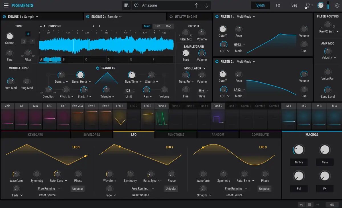 Pigments ist ein absolutes Powerhouse, da man von klassischer subtraktiver Synthese, über additive Synthese, FM, Sampler, Wavetable-Engine, Granularsynthese, die Utility-Engine, zwei Noise-Quellen und einen Sub-Oszillator in einer sehr übersichtlichen Oberfläche erhält, bei der praktisch alle Parameter auf einen Blick zu sehen sind.