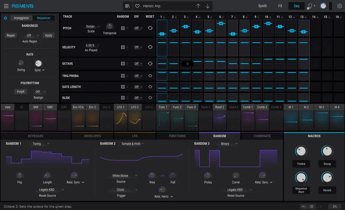 Auch der Sequenzer und Arpeggiator des Pigment ist einfach zu durchschauen und trotzdem leistungsfähig. Man kann Skalen wie Moll, Dur, Lydisch und die Tonart vorgeben. Wie beim Microfreak gibt es den Dice-Modus, der zufällige Muster erstellen kann. Gerade Sequenzer und Arpeggiator sind eine Quelle für Inspiration. Beide können übrigens auch als MIDI ausgegeben werden und damit andere Plugins oder externe Klangerzeuger steuern.