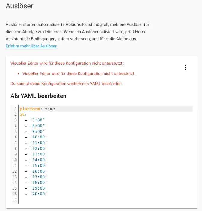 Möchte man jedoch mehrere Schaltzeiten, muss man etwas YAML-Code einfügen. Praktischerweise gibt es in HA für den “Time” Auslöser die Möglichkeit mehrere Zeiten als Liste anzugeben. Für die Aufgabe der Gartenbewässerung ist das ideal, da man hier selten andere Einstellungen benötigen wird.