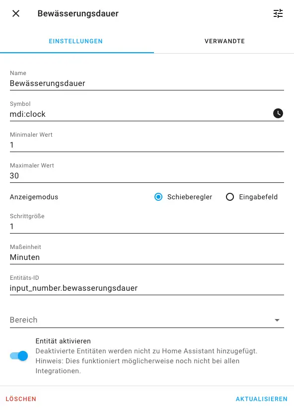 Außerdem wäre es praktisch, wenn man die Bewässerungsdauer im Frontend einstellen könnte. Dazu legt man sich unter Einstellungen -> Helfer einen Schieberegler an, mit dem man die Bewässerungsdauer in Minuten bestimmen kann.
