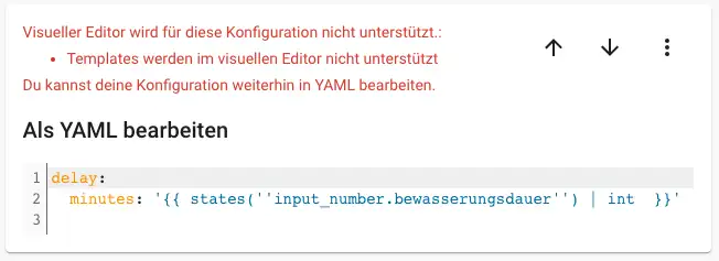 Um den Helfer mit der Zeiteinstellung in die Automation einbinden kann, bedarf es wieder etwas YAML, das die fest-codierte Verzögerungseinstellung ersetzt: