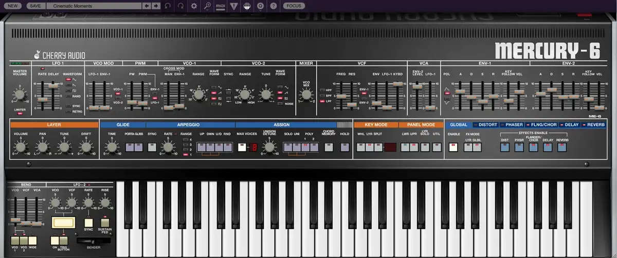 Zusätzlich ist der Jupiter-6 bemerkenswert, weil er einer der ersten Synthesizer war, der das MIDI-Protokoll demonstrierte und einen Split-Keyboard-Modus besaß. Mit dem Mercury-6 hat Cherry Audio die charakteristischen Eigenschaften und den klanglichen Charakter des klassischen Jupiter-6 bewahrt und zugleich neue Funktionen für die heutige Musikproduktionsumgebung hinzugefügt. Der Mercury-6 bietet eine erweiterte Split-Modus-Funktion sowie eine zweite Layer-Ebene, die in der Lage ist, riesige, gestapelte Klänge zu produzieren. Mit einer Polyphonie von 16 Noten ist der Mercury-6 zudem auch stimmlich erweitert im Vergleich zum Original. Darüber hinaus verfügt er über ein flexibles integriertes Effektpanel, erweiterte LFO-Funktionalität und mehr als 500 fachmännisch gestaltete Sound-Presets.