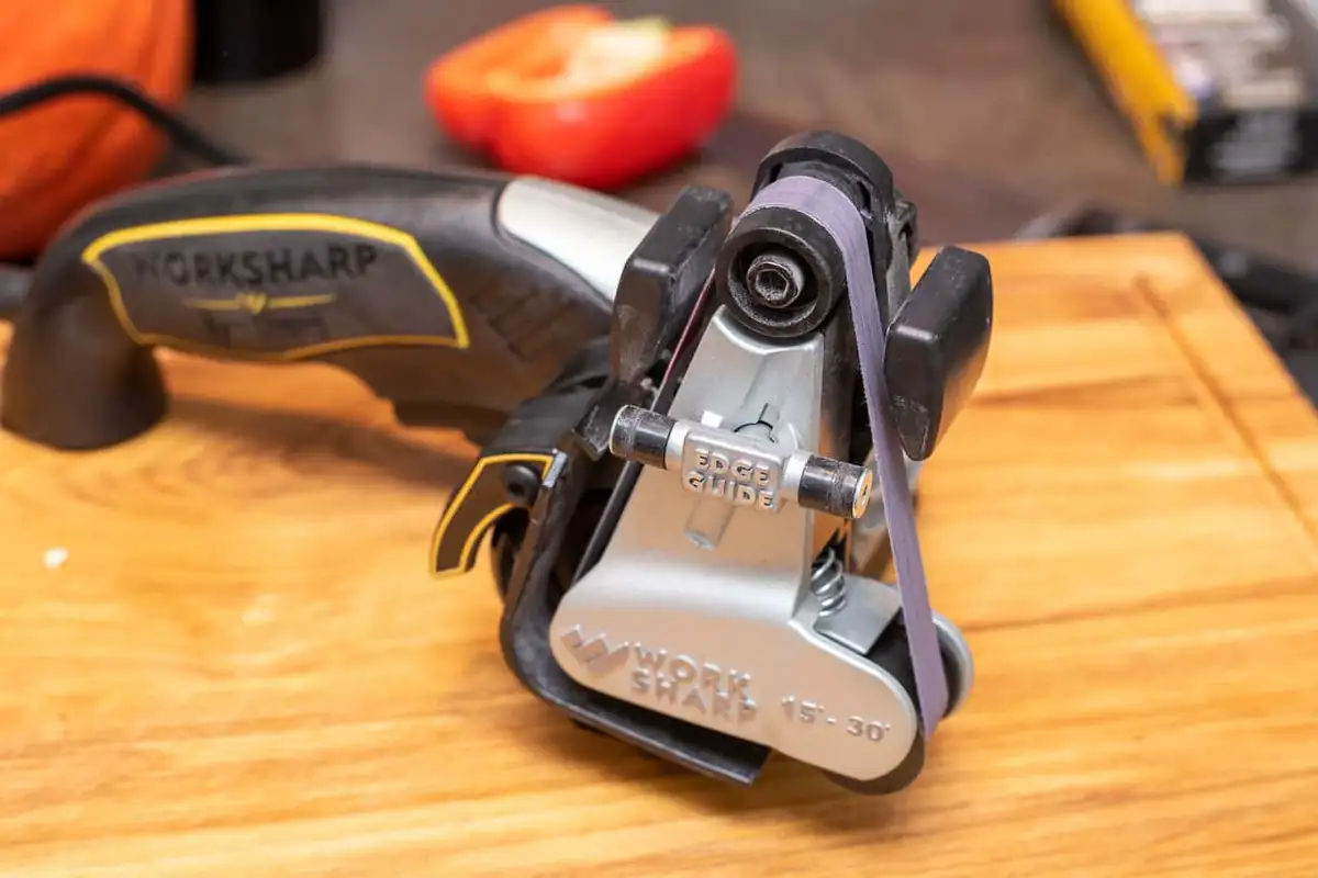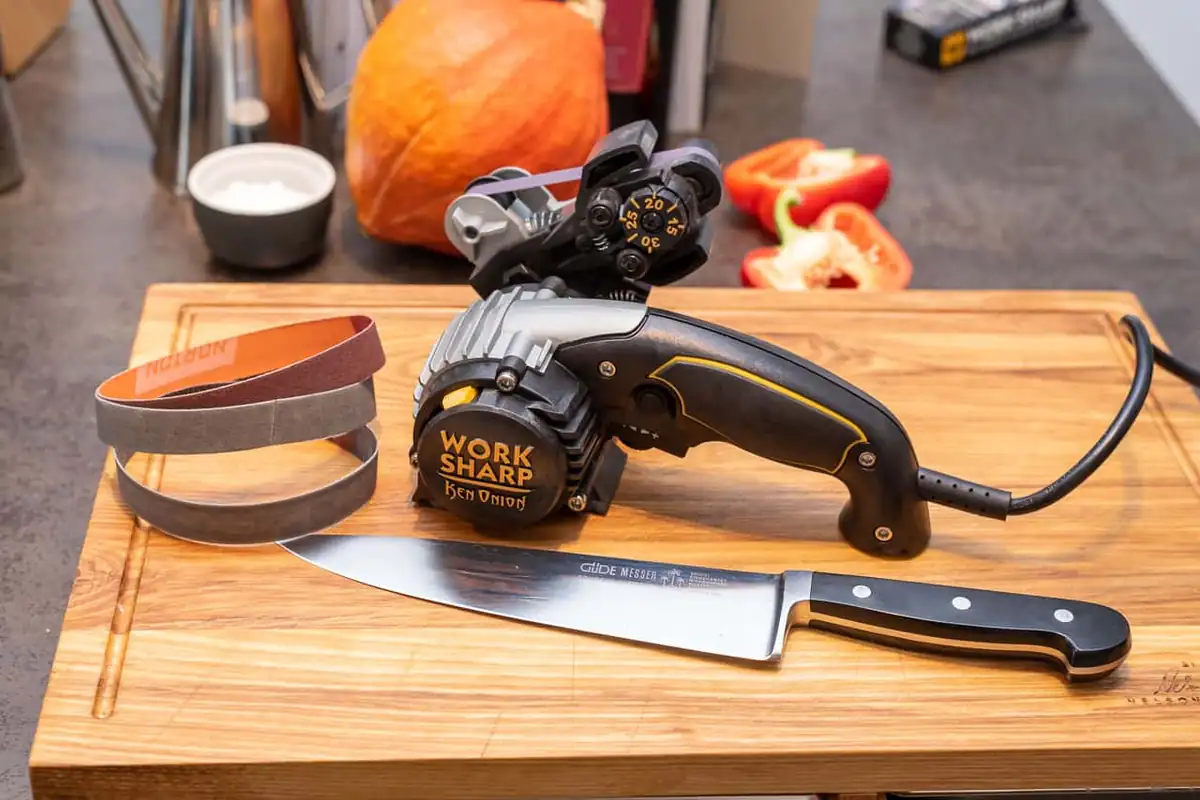 Der Work Sharp Messerschleifer sieht auch eher wie ein Elektrowerkzeug aus der Werkstatt, als ein Küchenutensil aus. Die Besonderheit des Work Sharp sind seine leicht austauschbaren Schleifbänder, sowie der einstellbare Anschlag samt Messerführung, welche einen exakten Schleifwinkel über die gesamte Messerlänge ermöglichen. Dabei können nicht nur Küchenmesser, sondern auch Jagdmesser, Äxte und Stechbeitel geschärft werden. Sogar Messer mit Wellenschliff (Brotmesser), gebogene Klingen und Rasenmähermesser lassen sich damit auf Vordermann bringen. Der Schleifwinkel lässt sich dabei zwischen 15 und 30 Grad per Einstellrad festlegen.