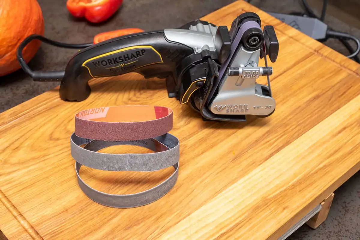 Mit dem Messerschleifer von Work Sharp kann man Kochmesser recht einfach und sicher von höheren Schneidwinkeln auf 15 Grad umschleifen, was mit Wassersteinen eine recht aufwendige und langwierige Angelegenheit ist, die viel Erfahrung erfordert. Beim Work Sharp liegen 4 Schleifbänder, die farblich gekennzeichnet und markiert sind bei: