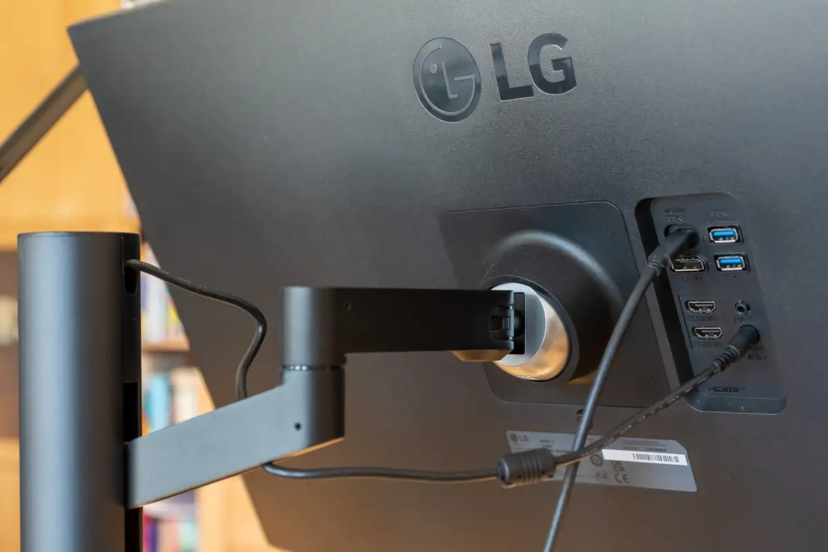 Ein Notebook kann den Monitor über den USB-C-Anschluss nicht nur als externes Display nutzen, sondern auch gleichzeitig geladen werden, sodass man sich das Netzteil sparen kann. Zusätzlich sind zwei HDMI-Anschlüsse und ein Displayport, sowie zwei USB 3.0 Buchsen auf der Rückseite zu finden. Hat man den LG-Monitor per USB-C mit dem Rechner verbunden, kann man an den USB-Anschlüssen z. B. eine Webcam und ein USB-Headset anschießen. Aber auch ein herkömmlicher Kopfhörer mit 3,5 mm Klinkenstecker kann direkt am Display angeschlossen werden.