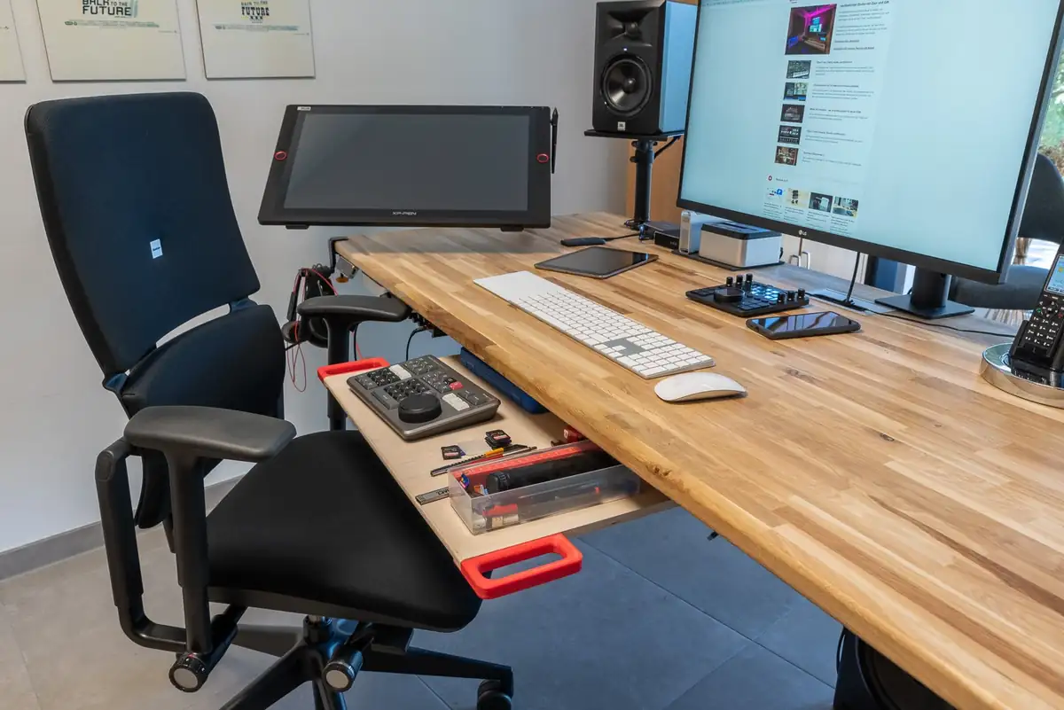 Die starke Massivholzplatte trägt auch große Displays mit Tischhalterung problemlos, so wie auch mein XPPen Artist 24 Pro Grafiktablett mit Display.
