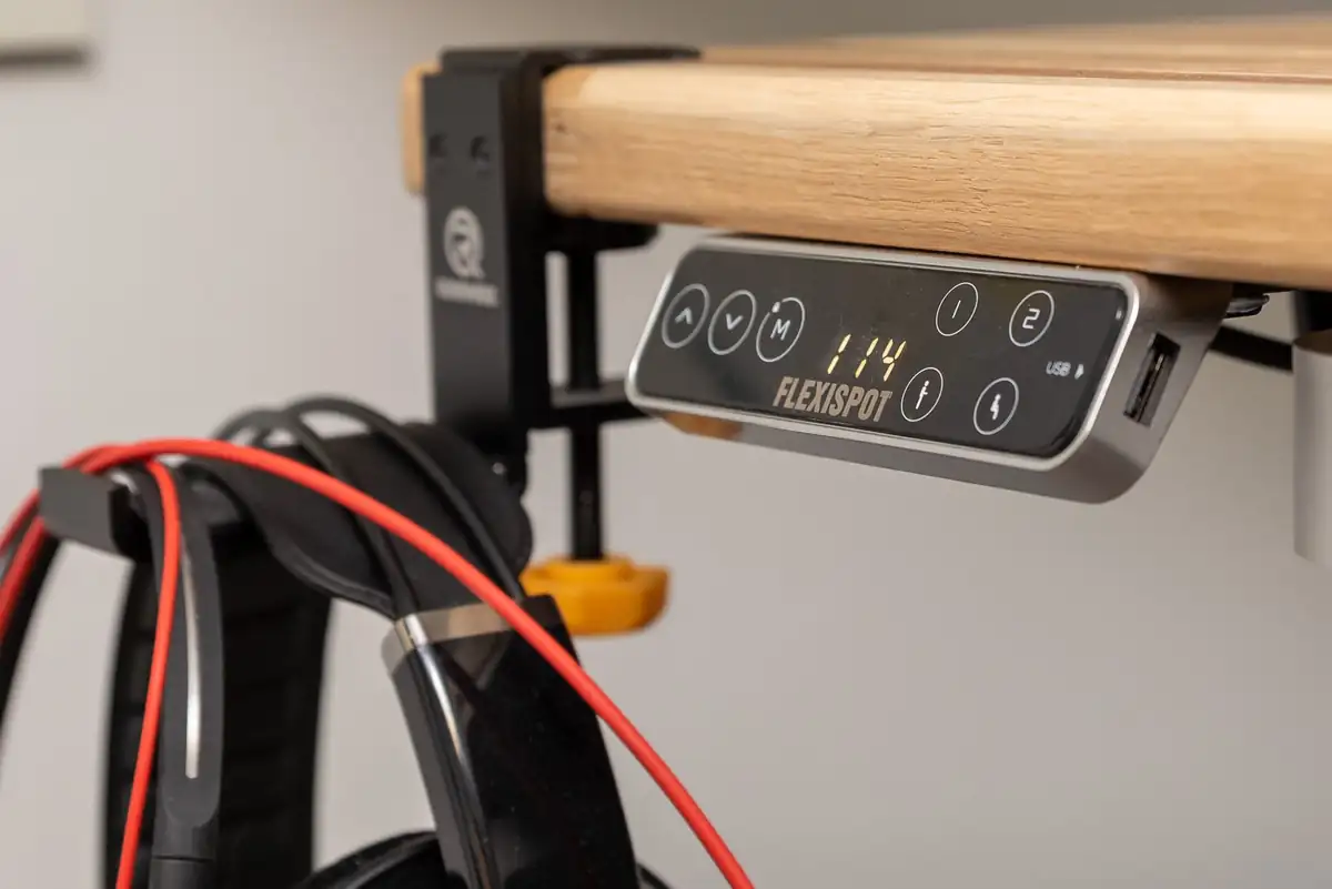Das Display des Flexispot E7 zeigt präzise die aktuell eingestellte Höhe an und der Tisch lässt sich über die schicke Bedieneinheit millimetergenau auf die gewünschte Höhe einstellen. Diese wird dann auch leise und relativ schnell angefahren. An der seitlichen USB-Buchse kann z. B. ein Smartphone aufgeladen werden. Der Strom kommt dabei aus dem Netzteil des Tischs.