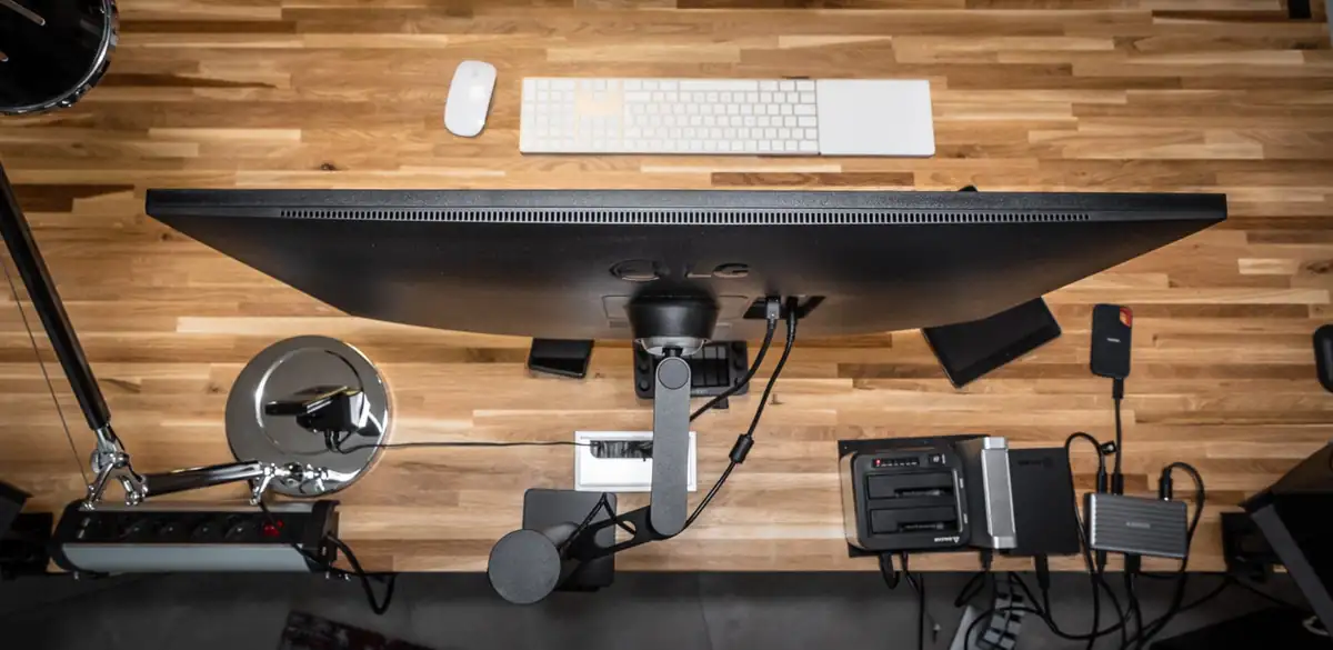 Da ich für die Videobearbeitung eine gute Abhöre benötige, habe ich meine JBL LSR305 Monitore ebenfalls auf Tischständern in optimaler Abhörposition platziert. Eine schmale LEDVANCE LED-Lampe , die sich auf dem Monitor befindet, leuchtet den Hauptarbeitsbereich dezent aus. Ein Halter für den Kopfhörer sorgt ebenfalls für Ordnung. Zudem gibt es unter der rechten Tischseite ein USB-Ladegerät mit mehreren Ausgängen, um Smartphone, Tablet, Maus usw. laden zu können. Eine kleine Magnetleiste hält die Stecker griffbereit unter der Tischplatte.
