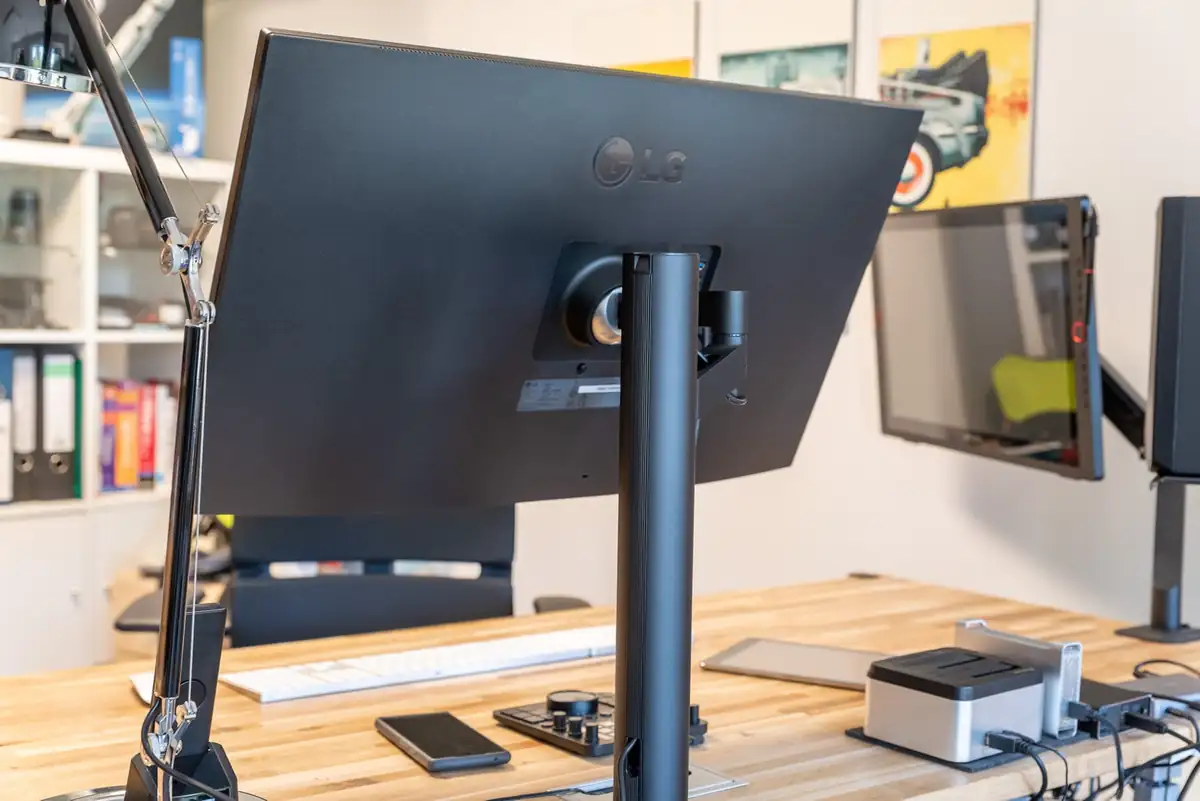 Ich habe ein LG Display aus der ERGO Serie im Einsatz. Dieses 31,5 Zoll UHD 4K (3.840 x 2.160) IPS-Display bietet nicht nur reichlich Platz, um auch mehrere Dokumente gleichzeitig lesbar darzustellen, sondern auch eine besondere Halterung, mit dem man ihn sehr flexibel und einfach in Höhe und Neigung einstellen kann. Natürlich gibt es auch Monitorarme als Zubehör. Bei den LG ERGO Displays ist diese Halterung aber perfekt integriert und Teil des Konzepts.