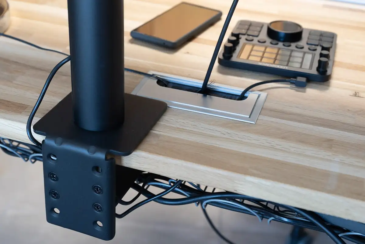 Ein Ausschnitt für einen Kabeldurchlass ermöglicht die unauffällige Verlegung von Kabeln. Der Clou ist aber eine Auszug unter dem Tisch, auf dem mein Blackmagic Design Speed Controller , Stifte und andere Dinge unauffällig Platz finden. Zudem habe ich meinen Mac Mini mit einer speziellen Halterung unter den Tisch verfrachtet.