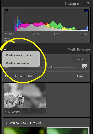Es gibt jede Menge kostenloser Lightroom-Profile - auch von anderen Herstellern, wie z. B. von On1 . Für Lightroom müssen diese LUTs aber im XMP-Format vorliegen. Viele LUTs aus dem Video-Bereich sind jedoch nur im Format .cube oder .3dl erhältlich. Importieren und verwalten kann man zusätzliche Profile auch im Profil-Browser, indem man das kleine + anklickt: