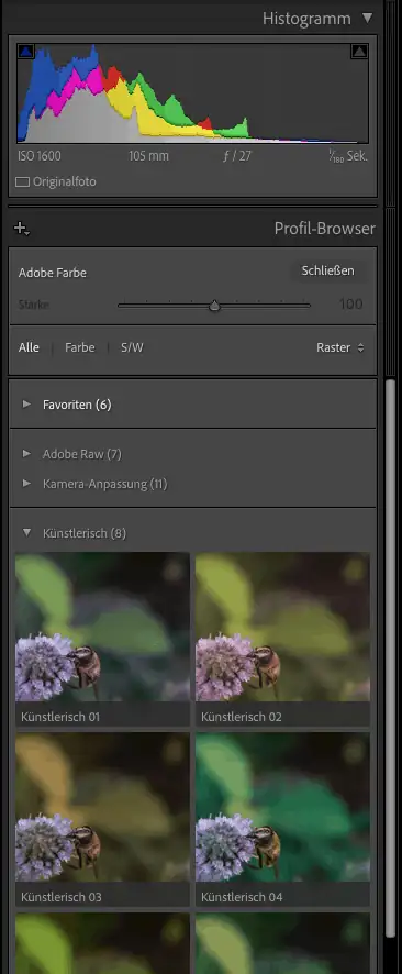 Seit einiger Zeit gibt es den Profil-Browser in den Grundeinstellungen im Entwicklungsmodul. Ein Klick auf die 4 kleinen Quadrate bringt ihn zum Vorschein - schön mit Vorschaubildern der Looks, von denen eine größere Anzahl zur Standard-Ausstattung von Lightroom Classic zählen. Hier kann man nicht nur das gewünschte Profile wählen, sondern auch dessen Intensität per Schieberegler justieren.
