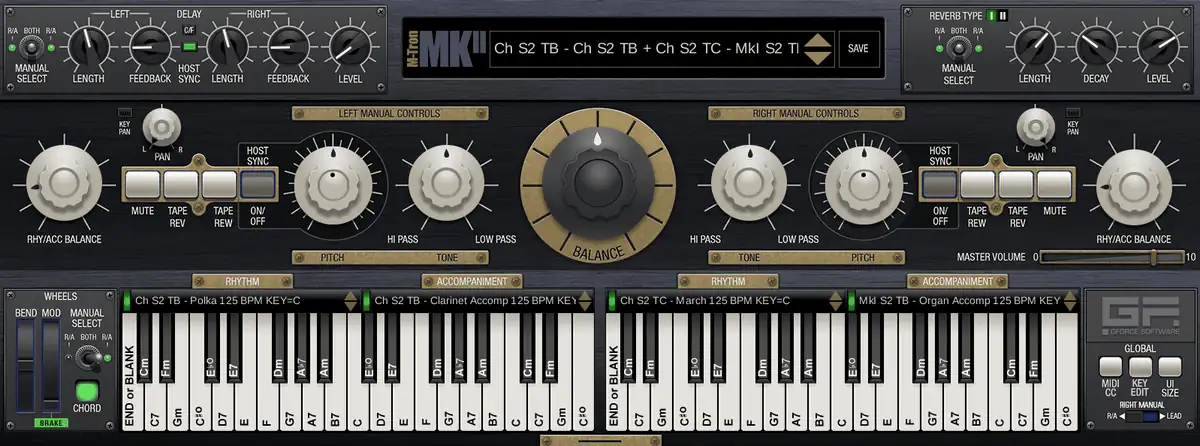 Mit dem GForce M-Tron Mk II wird das exklusive Vergnügen nicht nur für alle erreichbar, es hat auch mehr Sounds auf Lager. Während das Original mit zwei Tape-Bänken mit 16 Rhythmen und 16 Leadsounds auskommen musste, liefert GForce beim M-Tron Mk II gleich 132 Tapes mit, wovon einige bislang noch nie veröffentlicht wurden.
