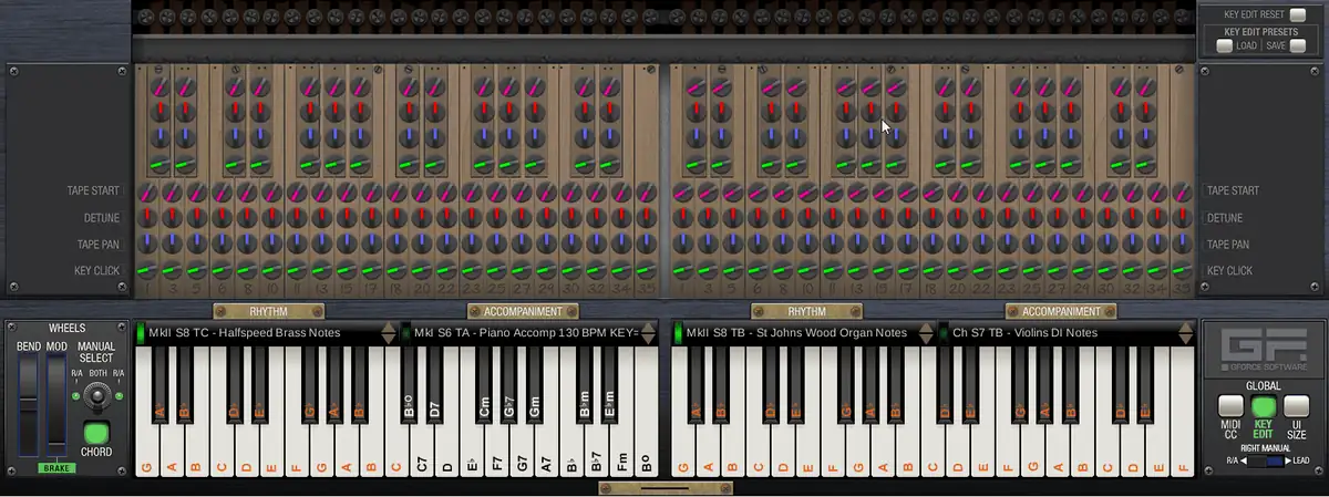 Unter der Haube stehen für jede Taste 4 Regler zur Verfügung, mit denen man jeden Ton individuell einstellen kann. So kann der Sound im Stereobild verteilt, verstimmt und der Start des Bandes pro Taste feinjustiert werden. Außerdem kann der Click-Sound der Tasten in der Lautstärke angepasst werden. Mit den Attack- und Release-Reglern, kann der Sound schon ordentlich verändert werden und das eingebaute Stereo-Delay (natürlich mit Host-Sync) und Reverb, dicken den Sound schön an. Eine Chord-Funktion hilft dabei, die richtigen Akkorde für die Begleitung zu finden.