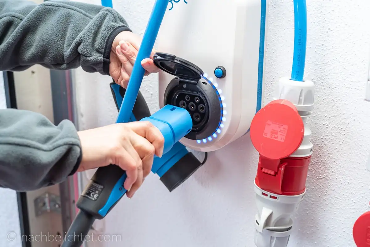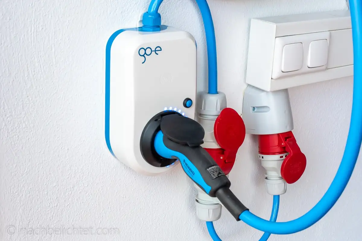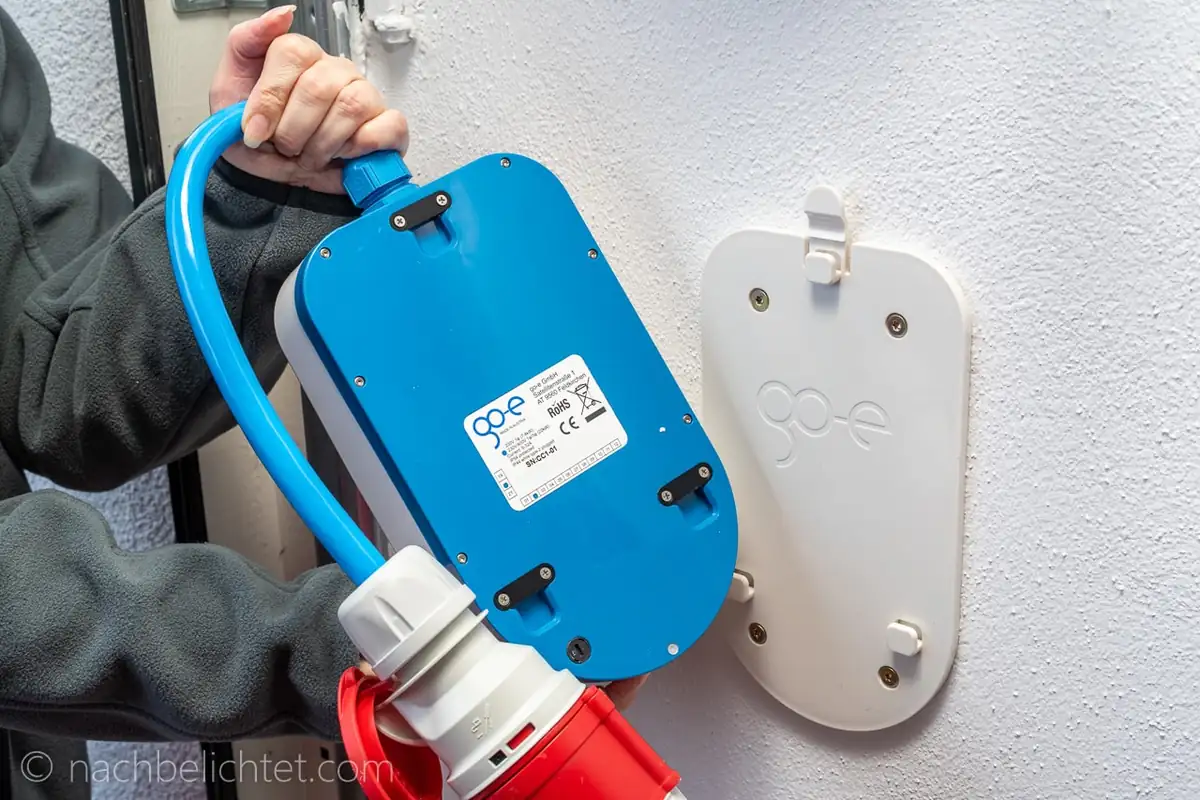 Der go-eCharger Home+ ist eine Wallbox, die nicht fest angeschlossen wird. Man kann den go-eCharger an einer CEE Dose , aber auch an einer blauen “Camping-Steckdose” oder herkömmlichen Haushaltssteckdose anschließen. Direkt am go-eCharger ist ein CEE 32 Stecker montiert, mit dem man bis zu 22 kW Ladeleistung erreicht. Am CEE 16 Adapter sind es noch 11 kW. Der Caravan CEE liefert noch 3,7 kW.