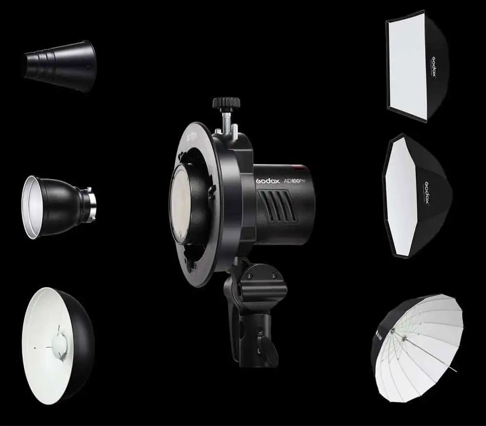 Godox bietet eigene Lichtformer für den AD100Pro an, die schnell und einfach angebracht werden können. Es passen aber auch andere Lichtformer mit Bowens-Anschluss.