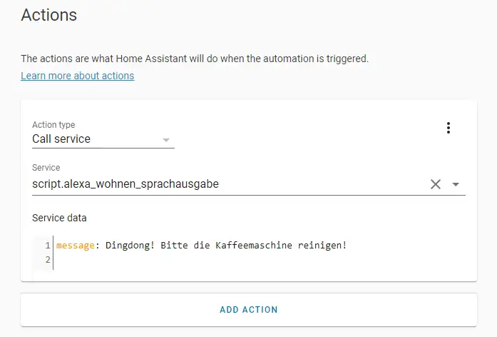 Da man natürlich nicht erst HA aufmachen oder die Home Assistant App öffnen möchte um zu sehen, ob man die Kaffeemaschine reinigen sollte, brauchen wir eine Benachrichtigungsfunktion. Da in der Küche ohnehin ein Amazon Echo steht, lassen wir das von Alexa übernehmen.