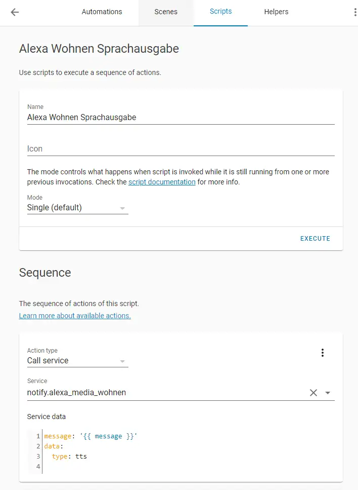 Die Action ist wieder ein Service. Der Service muss nun ein Script aufrufen, das wir selbst erstellen: Alexa Sprachausgabe. Dazu geht es in Configuration->Scripts und hier wird ein neues Benutzer-Script angelegt. Einer der großen Vorteile eines Scripts in Home Assistant ist, dass man beliebig viele Actions pro Script ausführen ( Sequence) und Scripte flexibel wiederverwenden kann, sofern man sie intelligent mit Variablen gestaltet.