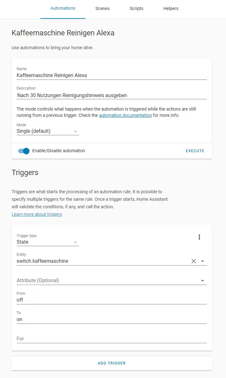 Um die Sache etwas übersichtlicher zu machen, legen wir eine weitere Automation an " Kaffeemaschine Reinigen Alexa". Auch hier wieder der Single-Modus. Als Trigger wieder State wenn die Entität switch.kaffeemaschine von off auf on wechselt.