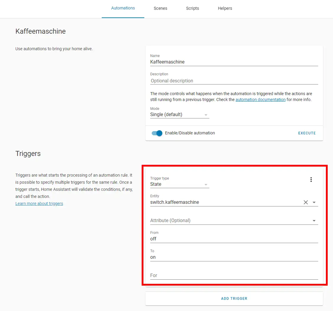 Als Mode wird Single eingestellt, da es sich um ein einzelnes Ereignis handelt. Nun braucht es einen Auslöser, einen Trigger, der der dann eine Action auslöst. In diesem Fall müssen wir auf den Status der switch.kaffeemaschine Entity schauen, weil wir wissen wollen, ob sie gerade eingeschaltet wurde.