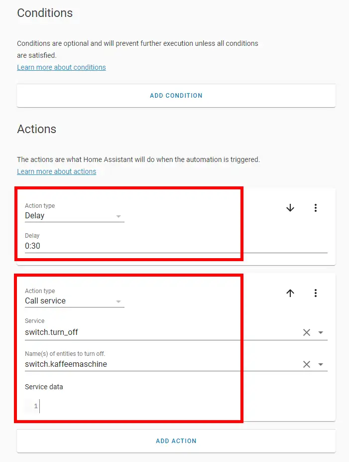 Nun kommt etwas Neues: eine Condition, also Bedingung. Unsere Bedingung ist, dass die Action nur ausführt wird, wenn die switch.kaffeemaschine auf on UND der Numeric state des counter.coffee_counter über 25 ist.