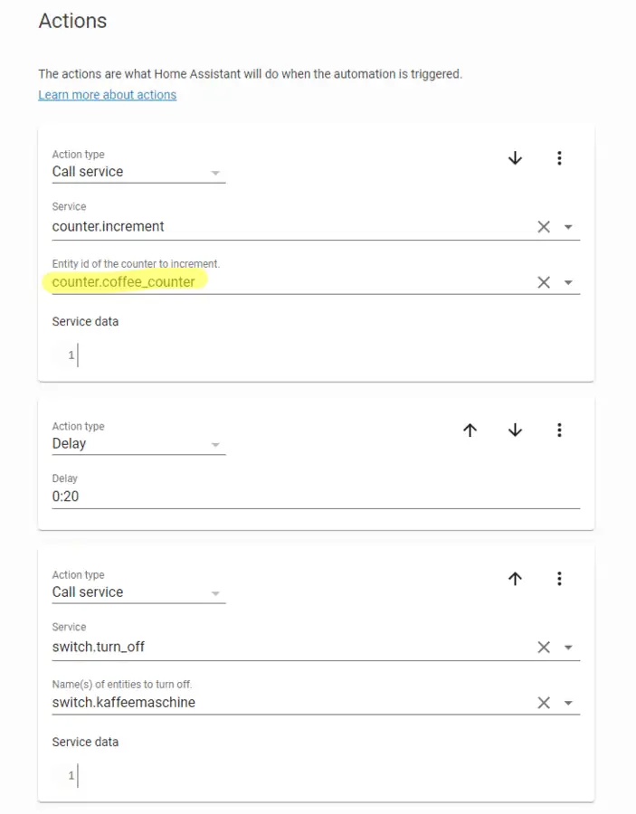 Das können wir gleich in die vorherige Automation einbauen, in dem man eine weitere Action anlegt. Diesmal VOR dem Delay, denn der Zähler soll ja gleich beim Einschalten um eins erhöht werden. Hier wird nun wieder ein Service aufgerufen, diesmal der counter.increment Service. Dem müssen wir nur noch mitteilen, welchen Counter er erhöhen soll, nämlich den counter.coffee_counter. Mit den Pfeilen rechts kann man die Action nun nach oben vor unsere Delay Action schieben.