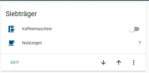 Nach der Installation steht die WLAN-Steckdose als neuer Switch und der Entity switch.kaffeemaschine zur Verwendung bereit. Entities können Schalter, Werte von Sensoren, Zähler, Steuerelemente von Mediaplayern wie z. B. “Play” oder Eigenschaften wie der Akkustand des Smartphones etc. sein. Sie liefern Informationen oder können von HA aus angesprochen werden, um Aktionen auszuführen.