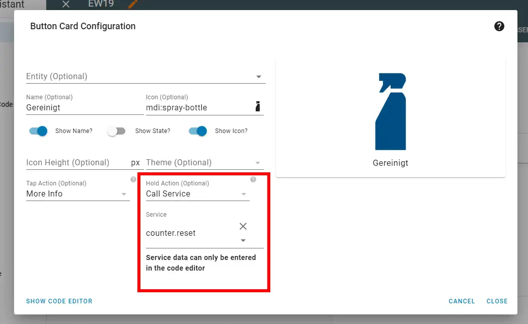 Damit man den Zähler nicht versehentlich zurückstellen kann, habe ich die hold_action als Auslöser genommen. Damit muss man das Icon lange drücken, damit die Aktion ausgeführt wird. Mit einem langen Klick auf die Button-Card wird nun also wieder ein Service ausgeführt, der die HA-Funktion counter.reset auslöst.