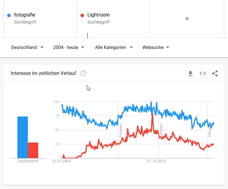 Darum haben sich die Themen in den letzten 3 bis 5 Jahren auch weiter weg vom ursprünglichen Hauptthema “Fotografie & Lightroom” bewegt und für mich ist das Thema auch etwas ausgelutscht. Technisch tut sich nicht mehr viel und durch das Smartphone ist die Fotografie bei allen angekommen. Ich war auch immer “Gebrauchsfotograf”, der Produkte und Werbefotos machte (und beruflich, neben anderen Dingen, noch immer macht). Sieht man sich das Thema bei Google Trends im zeitlichen Verlauf an, sieht man, dass auch das Interesse insgesamt schwindet. Ich habe das Gefühl, nichts mehr Relevantes dazu beitragen zu können, was nicht schon zigmal geschrieben wurde.