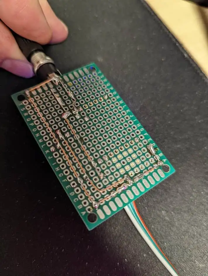 Ich habe die einfache Schaltung auf einem kleinen Perfboard aufgebaut. Der Wemos ist gesockelt, sodass man ihn nicht nur einfach austauschen könnte, sondern auch einen Testlauf ohne Controller machen und erst einmal auf korrekte Verkabelung testen kann.