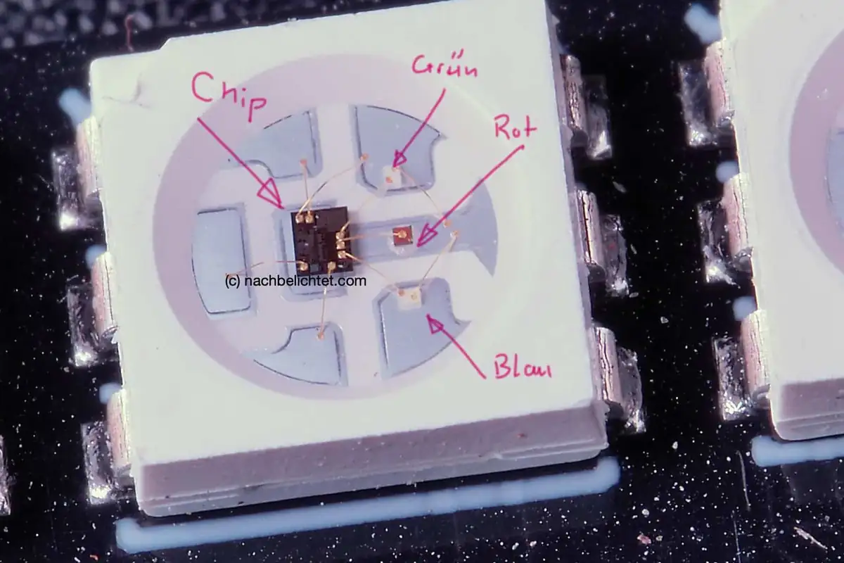 Diese Streifen lassen sich nach jeder LED, also etwa alle 3,3 cm trennen und so auf das gewünschte Maß bringen. Der Studiotisch ist beim Auszug 150 cm breit, also konnte ich den Streifen so zuschneiden, dass 45 LEDs übrig blieben - mehr als genug. Jedes WS2812 LED besteht eigentlich aus 3 kleinen einzelnen LEDs in rot, grün und blau, die mit einer Ansteuerelektronik in einem Gehäuse vereint sind. Werden alle 3 LEDs gleich hell angesteuert, entsteht ein weißes Mischlicht.