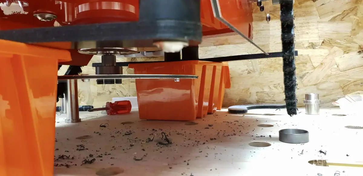 Bei der Messerscheibe muss man darauf achten, dass der Mähmotor gerade sitzt und die Scheibe ohne Unwucht läuft. Die Bohrungen der Gewindebuchsen, an denen später die Messer befestigt werden, kann man mit einer M6 Schraube etwas „vorschneiden“, dann lassen sich die Buchsen später einfacher und vor allem gerade eindrehen.