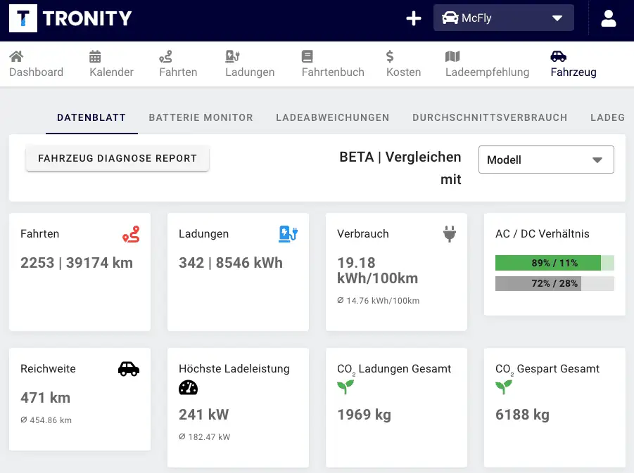 Das nächste Argument gegen das E-Auto ist immer die Batterie. Was, wenn die mal defekt ist und nach einem Jahr hat man ja eh nur noch die halbe Reichweite. Seit kurz nach dem Kauf, habe ich auch Tronity im Einsatz, das mir alle Fahrten und Ladungen auswertet.
