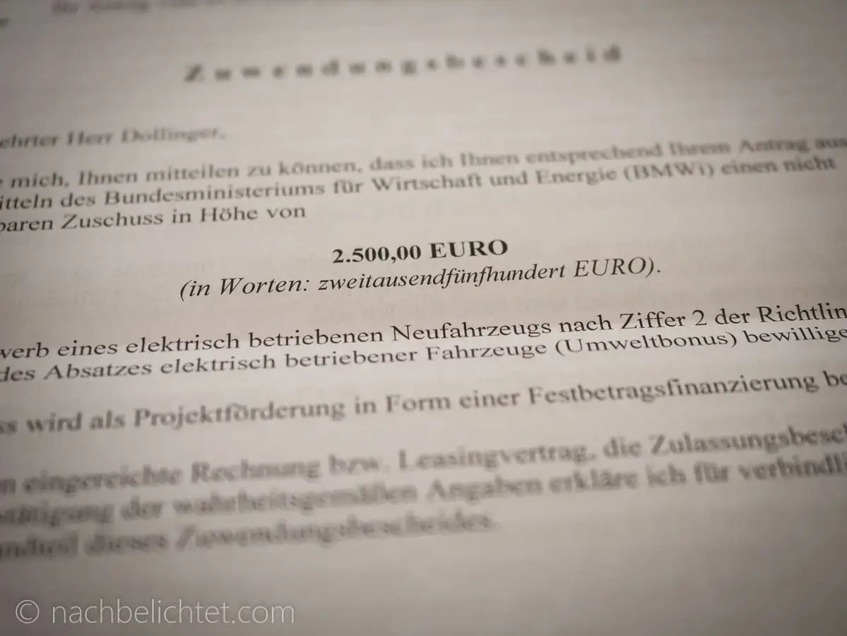 Nachdem ich mein Model 3 am 06.03.2020 angemeldet hatte, habe ich auch gleich den Förderantrag für die Umweltbonus ausgefüllt, was für eine deutsche Behörde erstaunlich komfortabel und reibungslos online ging. Am 13.05.2020 habe ich das Bewilligungsschreiben von der BAFA über 2.500 Euro erhalten und drei weitere Arbeitstage später war das Geld auch schon auf dem Konto.