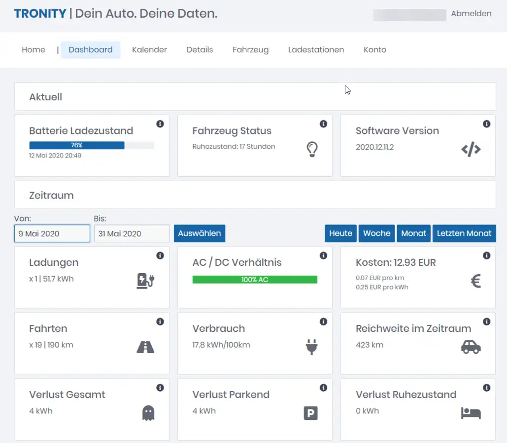 Sehr interessant zum Monitoring des Tesla (und anderer E-Autos) ist übrigens der Dienst von Tronity.io . Hier lassen sich alle Fahrten, Verbräuche und Ladevorgänge genauestens protokollieren.