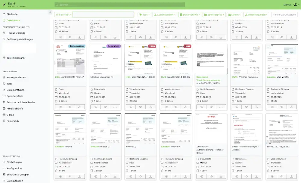 Paperless lernt mit der Zeit von selbst, die Inhalte zu kategorisieren und zu sortieren. Die Texterkennung ist ausgezeichnet, und die Volltextsuche hat mich noch nie im Stich gelassen. Backups der Datenbank und Inhalte gehen jede Nacht (verschlüsselt) zu einer Hetzner Storage Box .