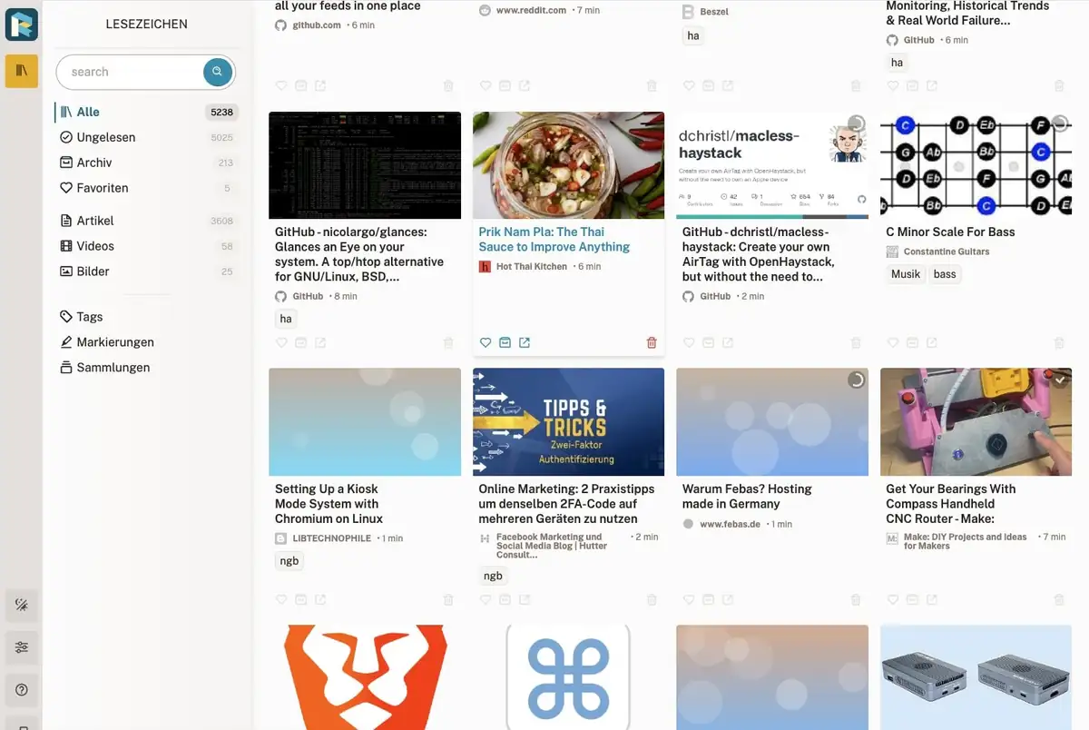 Auf meiner Suche nach einer selbst gehosteten Alternative, bin ich von Wallabag über Hoarder (zu instabil und komplex) zu Readeck gekommen. Readeck bot einen Omnivore-Importer an und damit sind die Bookmarks nun auf meinem eigenen Server.