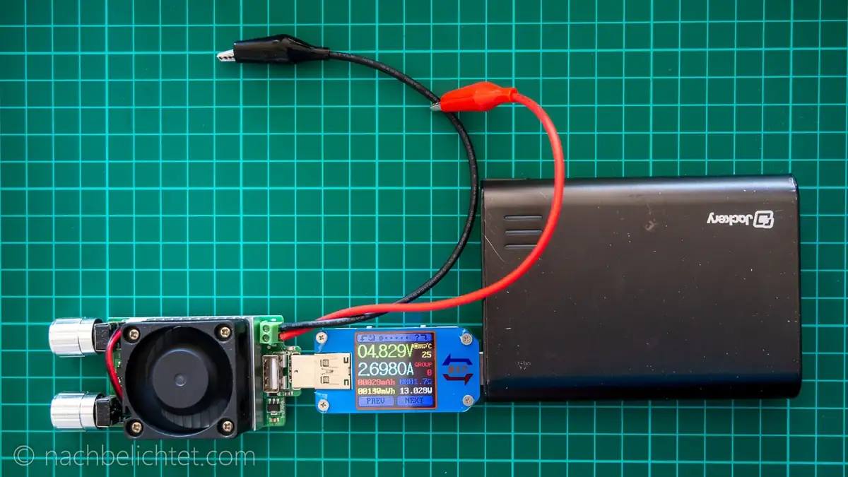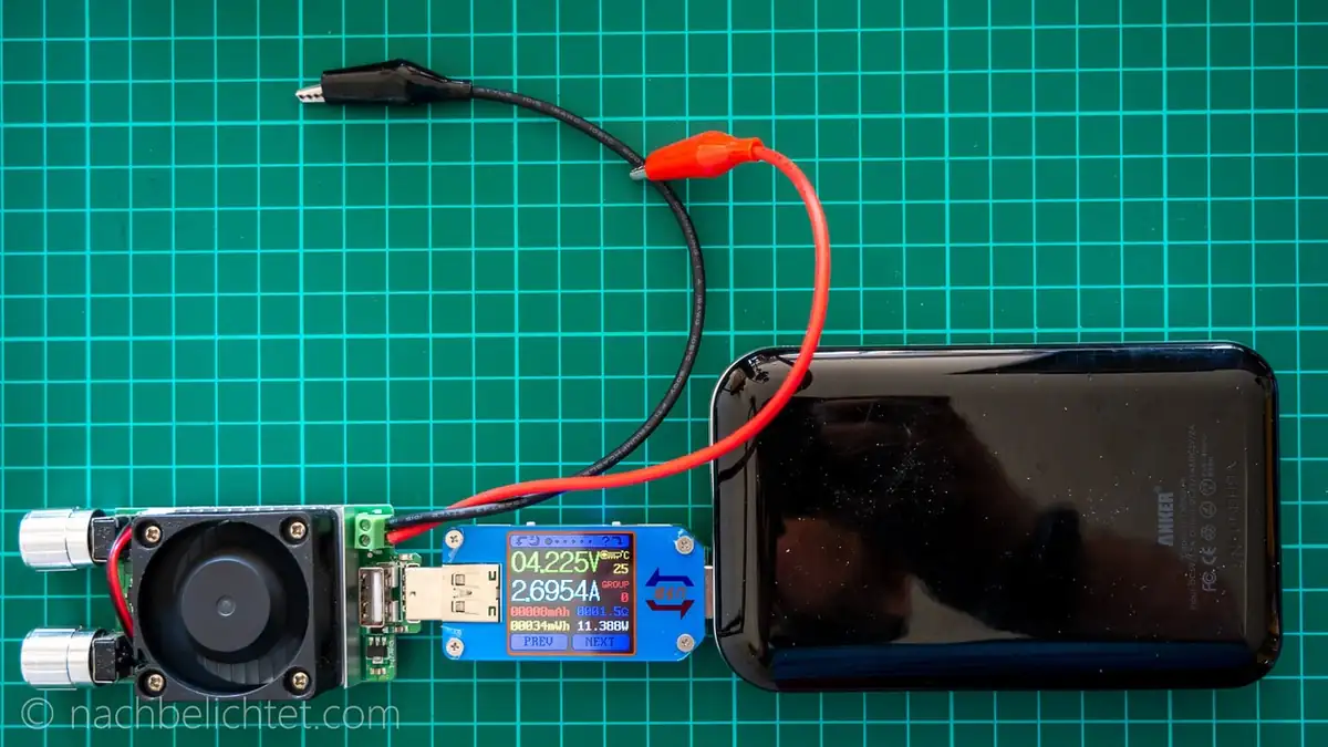 Solche Tests lassen sich übrigens schnell und recht preiswert mit dem USB-Tester von Rui Deng (gibt es auch unter vielen anderen Namen) und einer elektronischen Last für USB-Anschlüsse machen. Für den USB-Tester gibt es sogar eine Desktop- und Smartphone-App (nur Windows und Android), mit der man die Daten per Bluetooth-Verbindung aufzeichnen kann.
