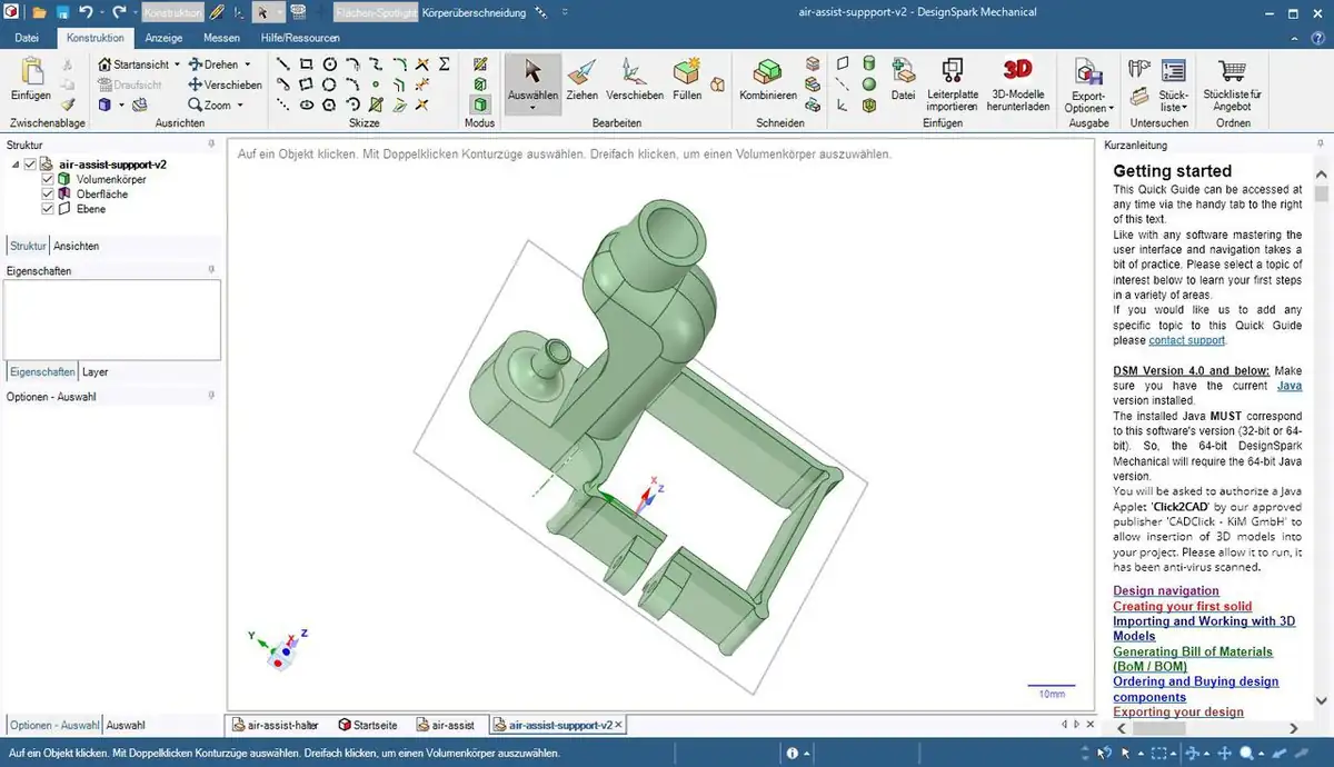 Die beiden Teile stelle ich euch als RSDOC-Projekt für die kostenlose CAD-Software Design-Spark Mechanical und als STL-Datei zur Verfügung. Das könnt ihr an eure Bedürfnisse anpassen oder als Grundlage für eigene Konstruktionen nehmen. Den kleinen Arm für die Düse müsstet ihr noch an eure Anforderungen anpassen. Zusammen- und am Lasermodul in Position gehalten werden die Teile mit M3 Schrauben mit 20 mm Länge.