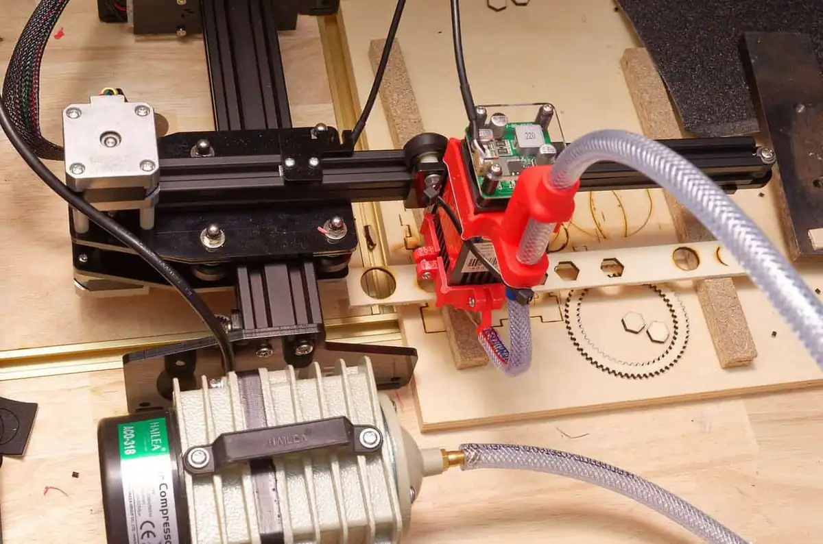 Die Luftzufuhr erfolgt über einen 6 mm Gewebeschlauch zum Lasermodul. Für den Air-Assist habe ich zwei Halterungen entworfen und mit meinem Wanhao Duplicator 6 mit ABS-Filament 3D-gedruckt.