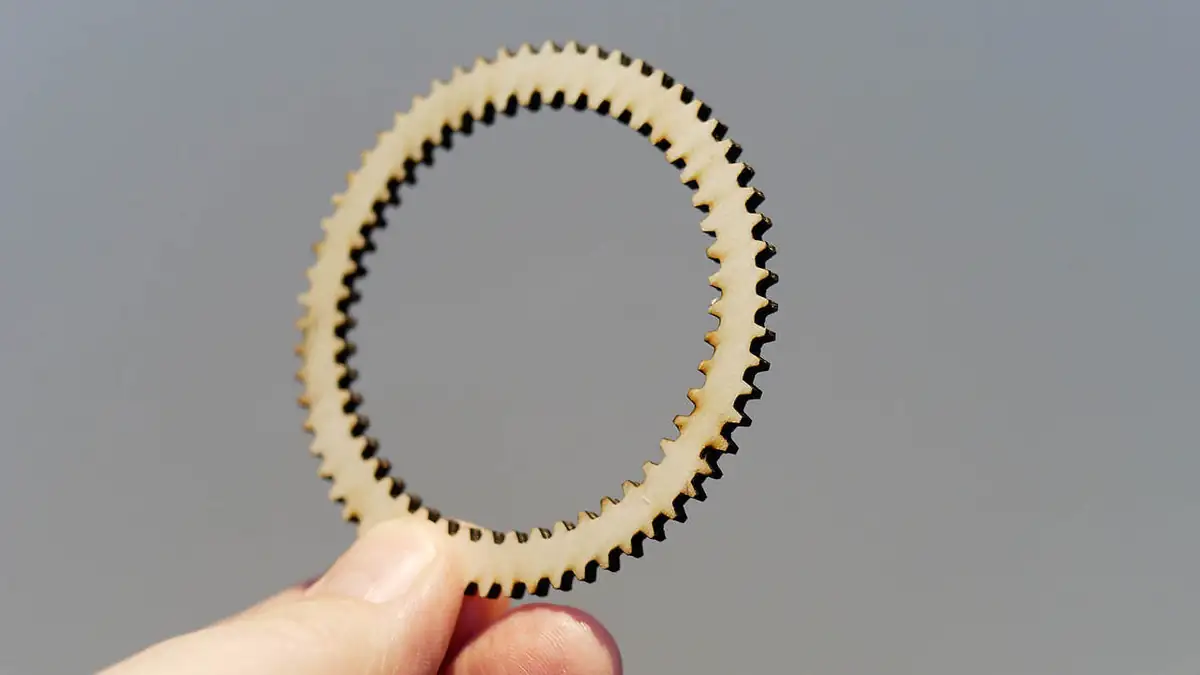Ich bin tatsächlich mehr als überrascht, wie viel besser der Ortur mit dem Air-Assist arbeitet und dass meine Air-Assist-Konstruktion gleich optimal funktionierte und passte. Für 4 mm Sperrholz braucht man 3 Durchgänge bei 3 mm/s und selbst 6 mm Sperrholz schaffte der Ortur mit 20 Watt bei 2 mm/s und 6 Durchgängen, sofern man den Brennpunkt auf die Hälfte der Materialstärke justiert. Das Justieren der Linse macht übrigens dieses Einstellrad bei Thingiverse sehr viel einfacher und genauer.