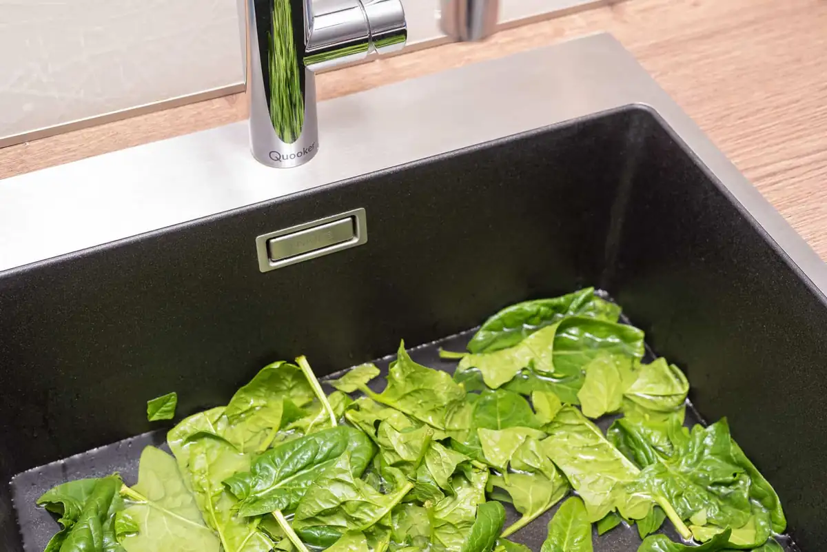Der Quooker eignet sich aber auch hervorragend zum blanchieren von etwa frischem Spinat. Da man diesen ohnehin waschen muss, was in der sauberen Spüle mit kaltem Wasser am einfachsten ist, kann man ihn nach dem Säubern auch gleich noch darin blanchieren.