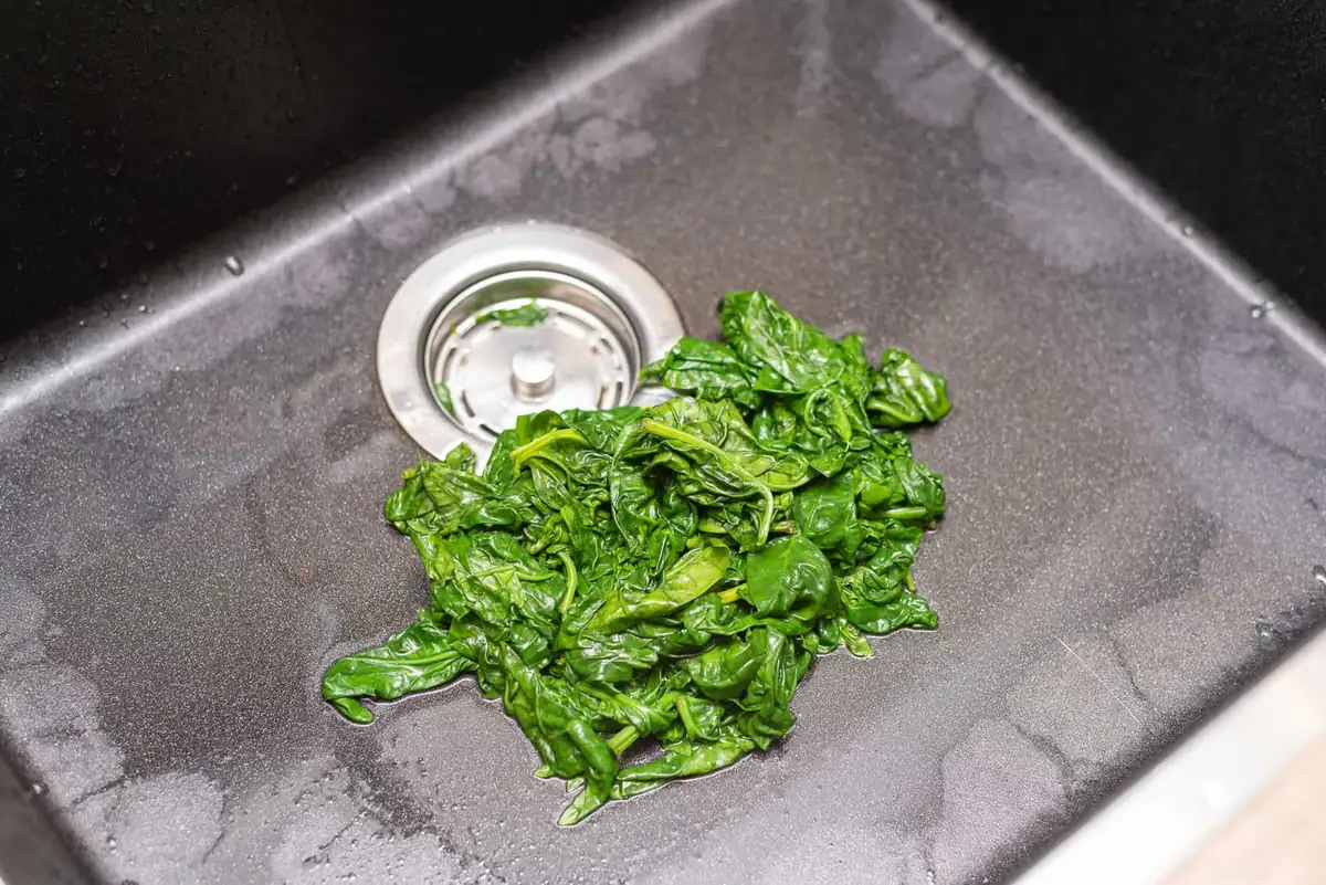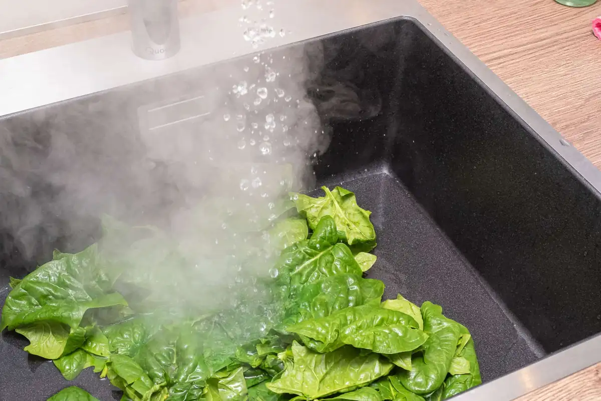 Dazu schließt man den Abfluss und überbrüht den Spinat mit 1-2 Litern kochendem Wasser aus dem Quooker und rührt ihn etwas um. Der Spinat fällt sofort zusammen und wird tiefgrün, bevor man überhaupt einen Topf aufgesetzt hätte.