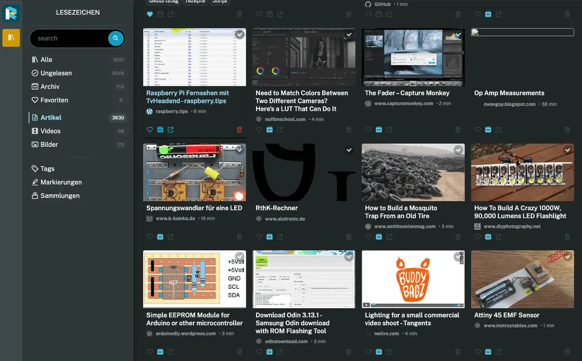 Wenn ich Themen recherchiere oder einfach wieder einmal von einem Thema zum nächsten, zum nächsten und zum übernächsten surfe, speichere ich auf meinem Weg alle interessanten Inhalte ab, um sie später zu lesen. Readeck sagt mir, was ich davon schon gelesen oder zumindest angefangen habe. Damit entsteht eine Wissensdatenbank, die ich schnell durchsuchen kann, wenn etwa das selbe Problem wieder einmal auftaucht.