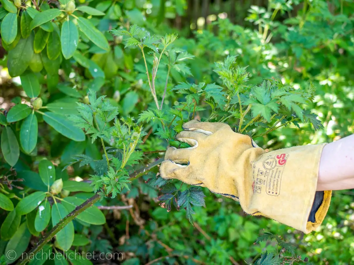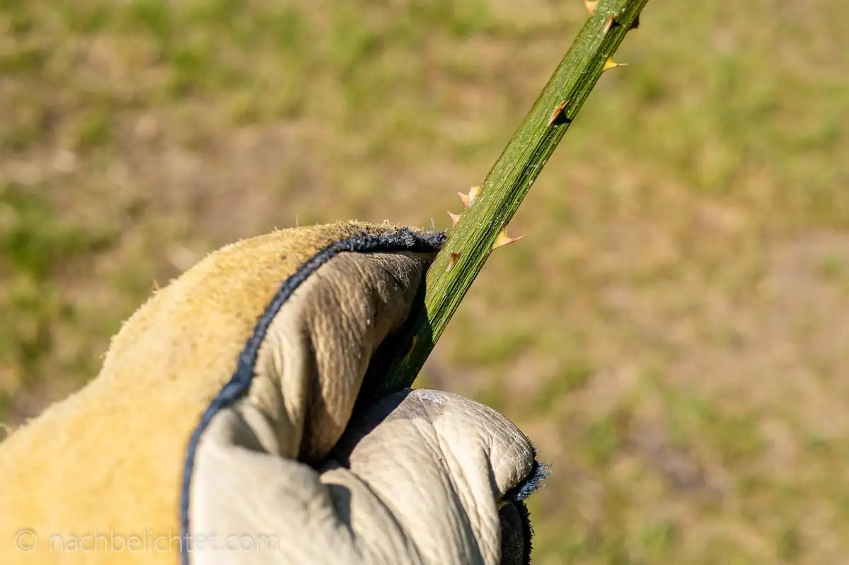 Mit diesen Handschuhen kann man die langen Ranken beherzt und bedenkenlos greifen und herausziehen. Bislang ging nicht ein Dorn durch den Handschuh. Natürlich solltet ihr auch entsprechendes Schuhwerk (Gummistiefel eignen sich besser als Turnschuhe), lange Hosen und langärmlige, aber glatte Kleidung tragen. Ideal eignen sich hier Schnittschutzhosen und Forstjacken , wie man sie beim Umgang mit Kettensägen trägt.