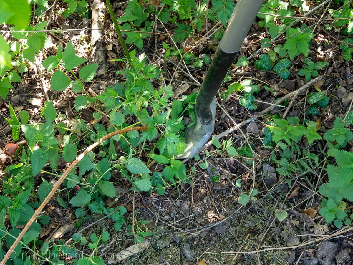 Sofern ihr die Brombeere komplett entfernen wollt, ist es sinnvoll, diese nicht zu dicht am Boden abzuschneiden. Lasst sie einen halben Meter herausschauen und grabt sie dann mit einem Spaten aus. Dazu genügt meist ein gezielter, spaten-tiefer Stich in ca. 10 cm Entfernung zum Trieb. Die Wurzel der Brombeere lässt sich dann recht einfach und komplett heraus hebeln.