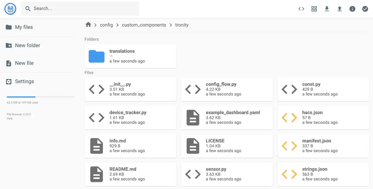 Im custom-components Ordner von Home Assistant einen neuen Ordner tronity erstellen und den entpackten Inhalt hineinkopieren. Nicht nur dazu eignet sich das File Browser Addon sehr gut.