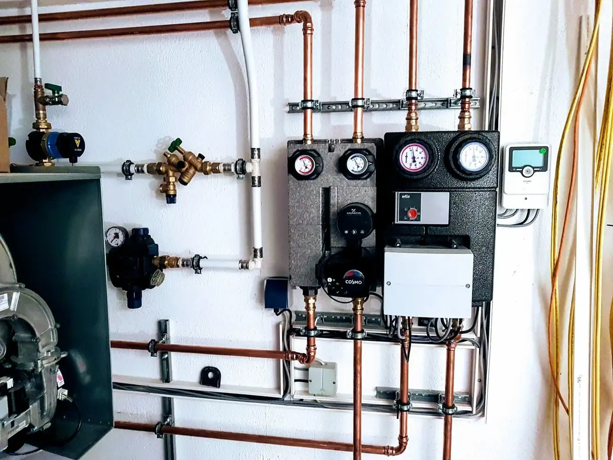 Unser Haus wurde 1964 massiv gebaut und zwischen 2016 und 2018 komplett renoviert. Die Böden kamen raus und Fußbodenheizung hinein und da von den Vorbesitzern noch ein Gasanschluss ins Haus gelegt wurde, war eine Viessmann Gasbrennwerttherme die Heizung der Wahl, den sowohl Gerät als auch das Gas waren sehr preiswert. Ergänzt wurde die Heizung durch einen Kamin mit Wasserführung, mit dem man das gesamte Haus heizen und Brauchwasser erwärmen kann. Dazu steht im Technikraum ein großer Pufferspeicher, der die Wärme des Kamins aufnehmen und nach und nach an das Heizsystem abgeben kann.